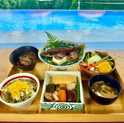 プライベート感溢れる個室で、当店自慢のそば御膳をお召し上がりいただけるプランです◎風味豊かな手打ち蕎麦に、熊本名物の高菜ごはん、郷土料理の田楽盛り合わせ、心温まるだご汁が並びます。地元の旬の恵みを詰め込んだ箱物や季節の野菜サラダも添えられ、阿蘇の伝統と四季を感じさせる特別な御膳。ぜひご賞味ください!